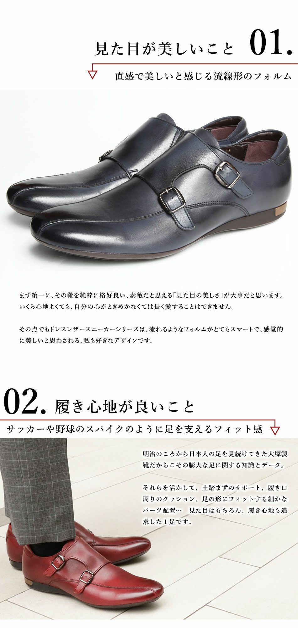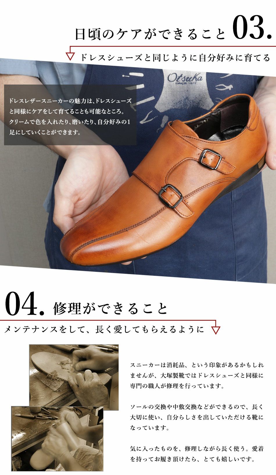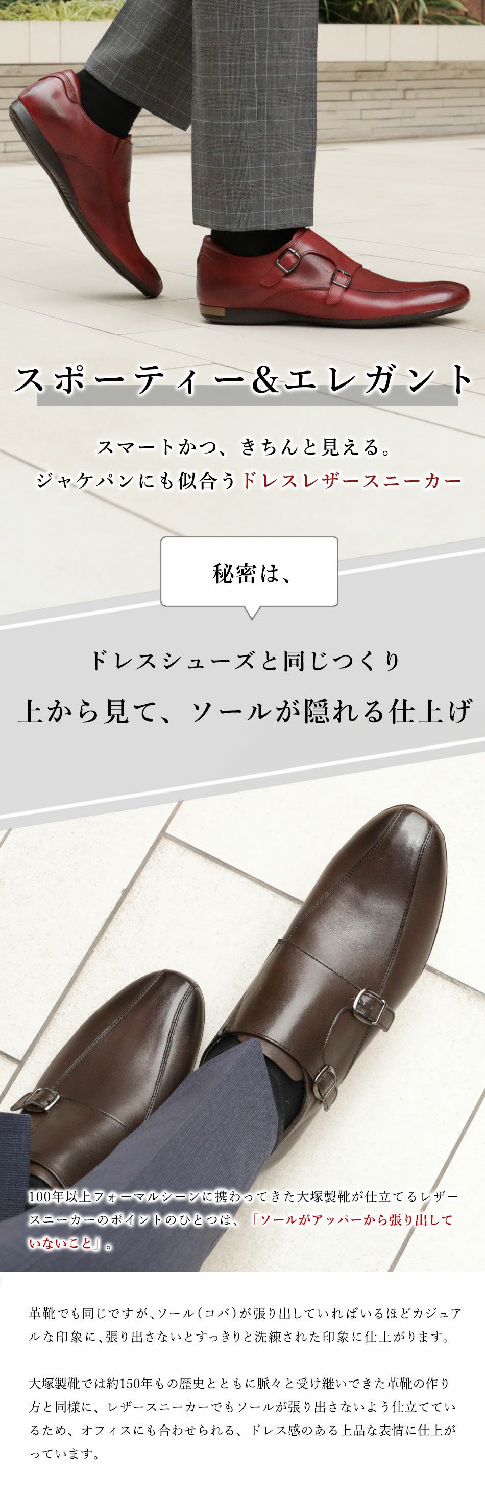 他の画像を見る 大塚製靴(OTSUKA/オーツカ) 颯爽と履きこなす オープン・カーの開放感 RG-6008 スワールモンク クラシックレザースニーカー 税込価格 ¥ 43,890 税込 カートに入れる お気に入りに登録する