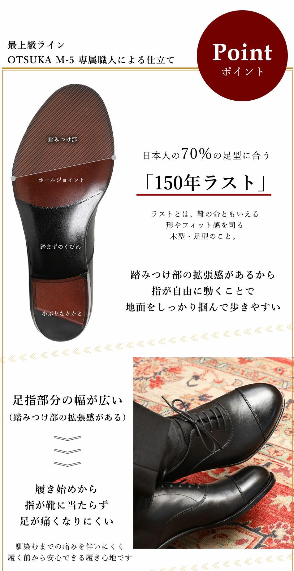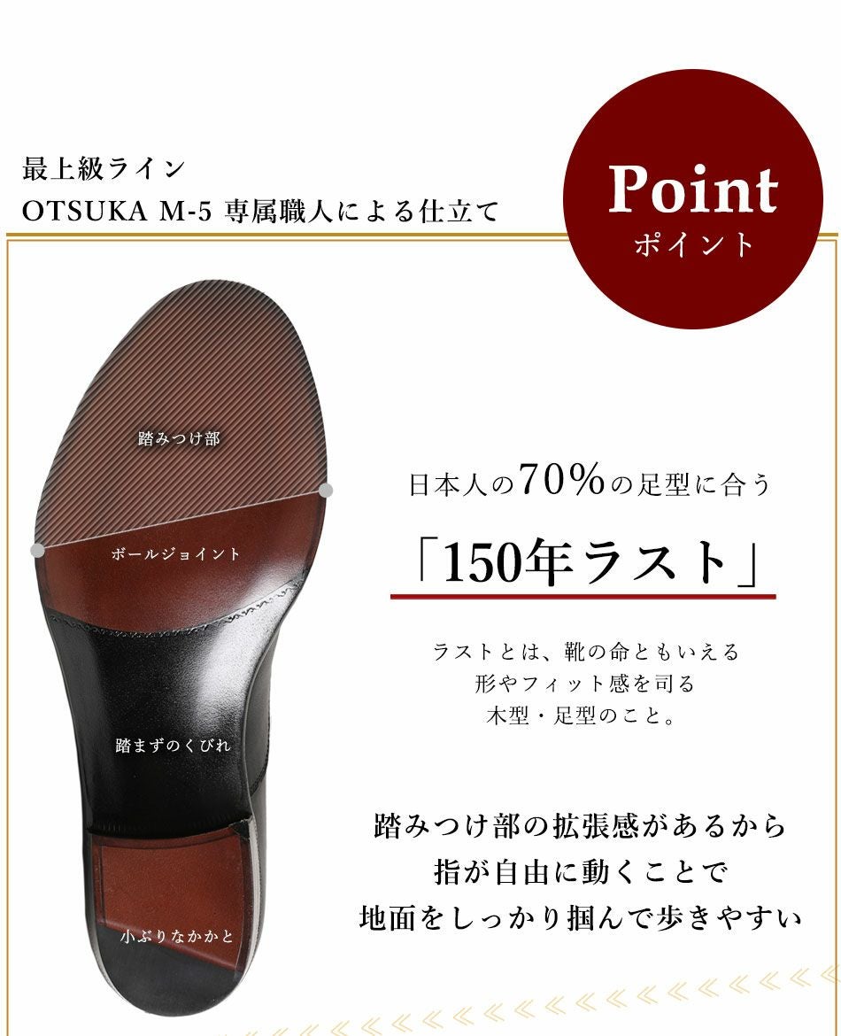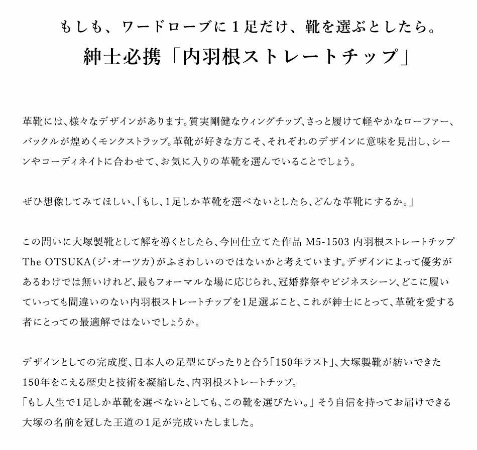他の画像を見る 【大塚製靴/オーツカ/otsuka】最上級ライン OTSUKA M-5 「人生で1足選ぶなら、この靴を」大塚製靴150年を込めた M5-1503 内羽根ストレートチップ “The OTSUKA”(ジ・オーツカ) ブラック 日本人の70%の足型に合う「150年ラスト」【2026年5月下旬頃出荷】 予約商品 予約販売価格 ¥ 109,890 税込 カートに入れる お気に入りに登録する