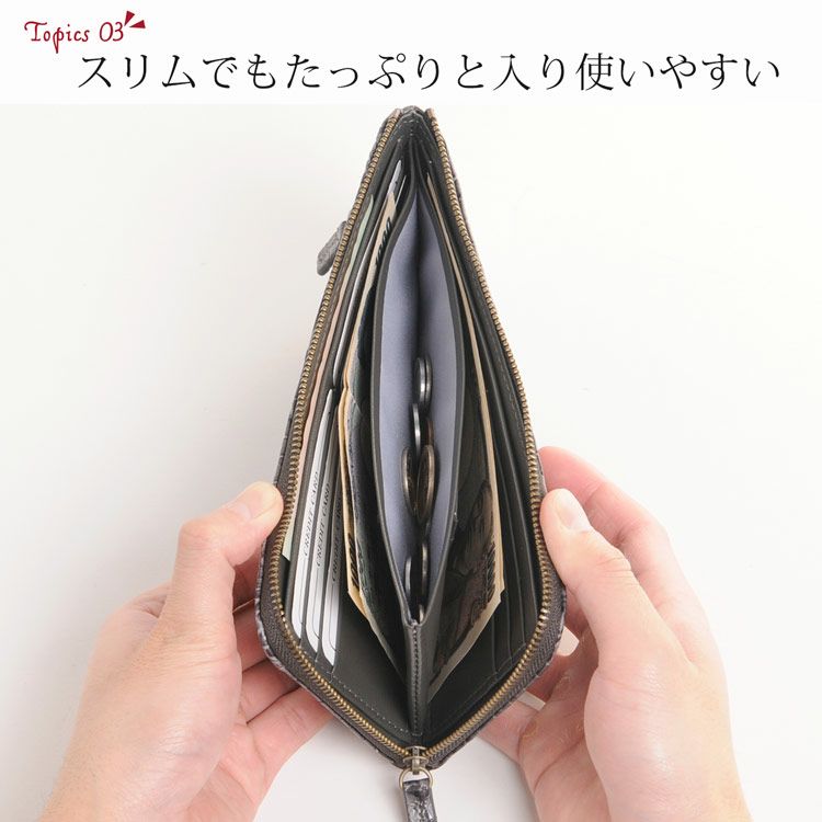 収納力と開閉のラクさを兼ね備えたバランスタイプ、L字ファスナー