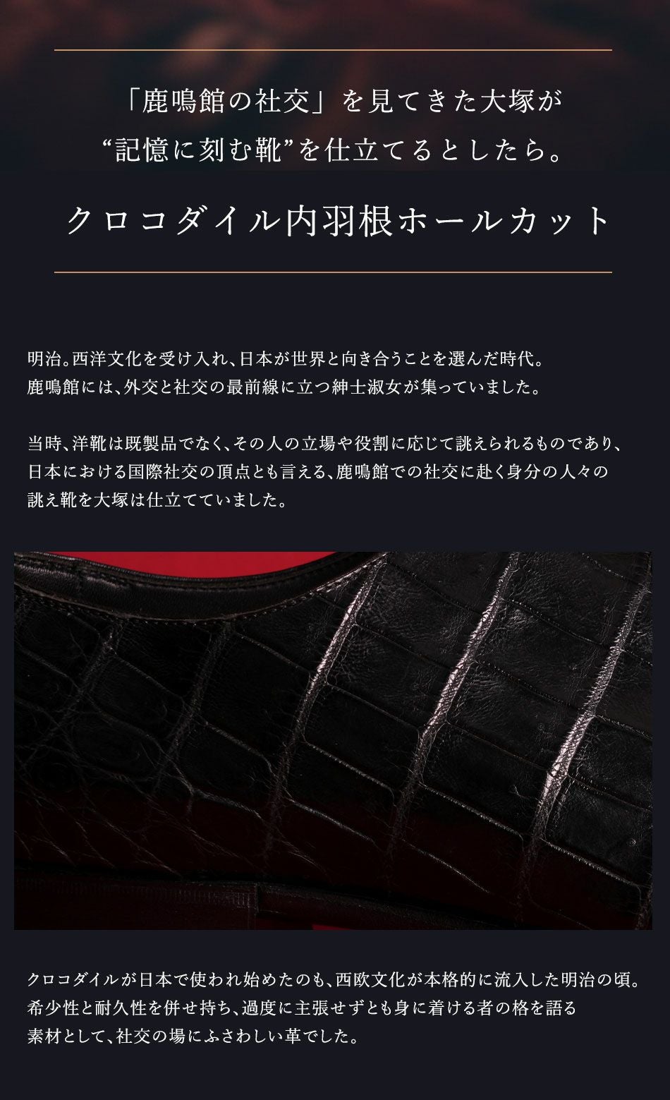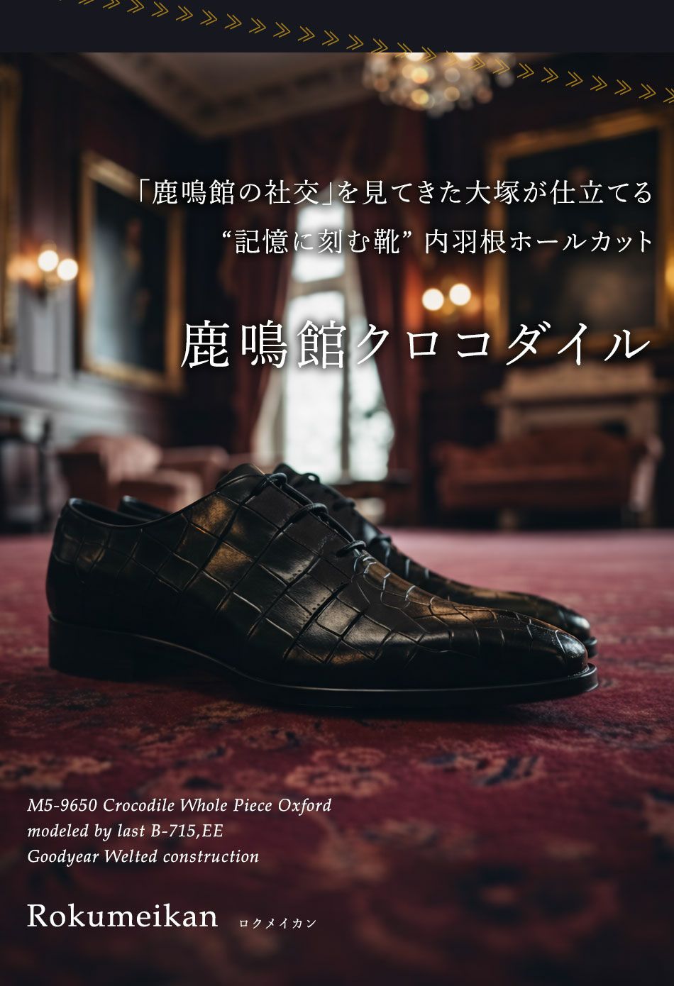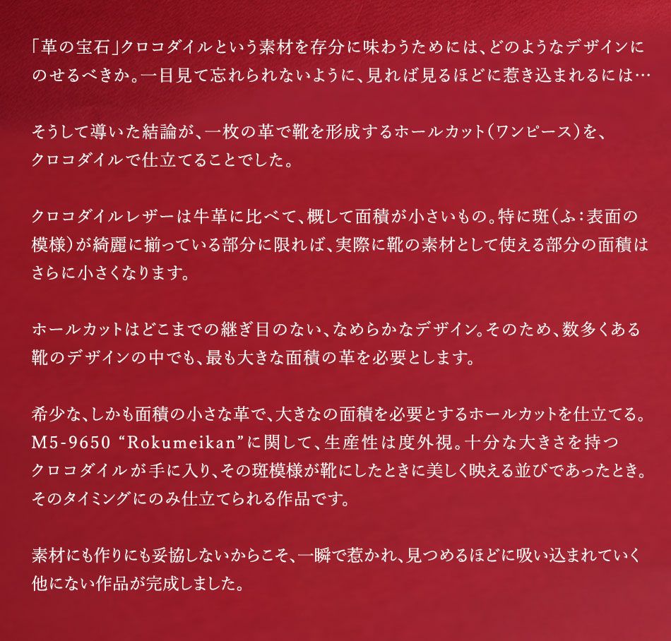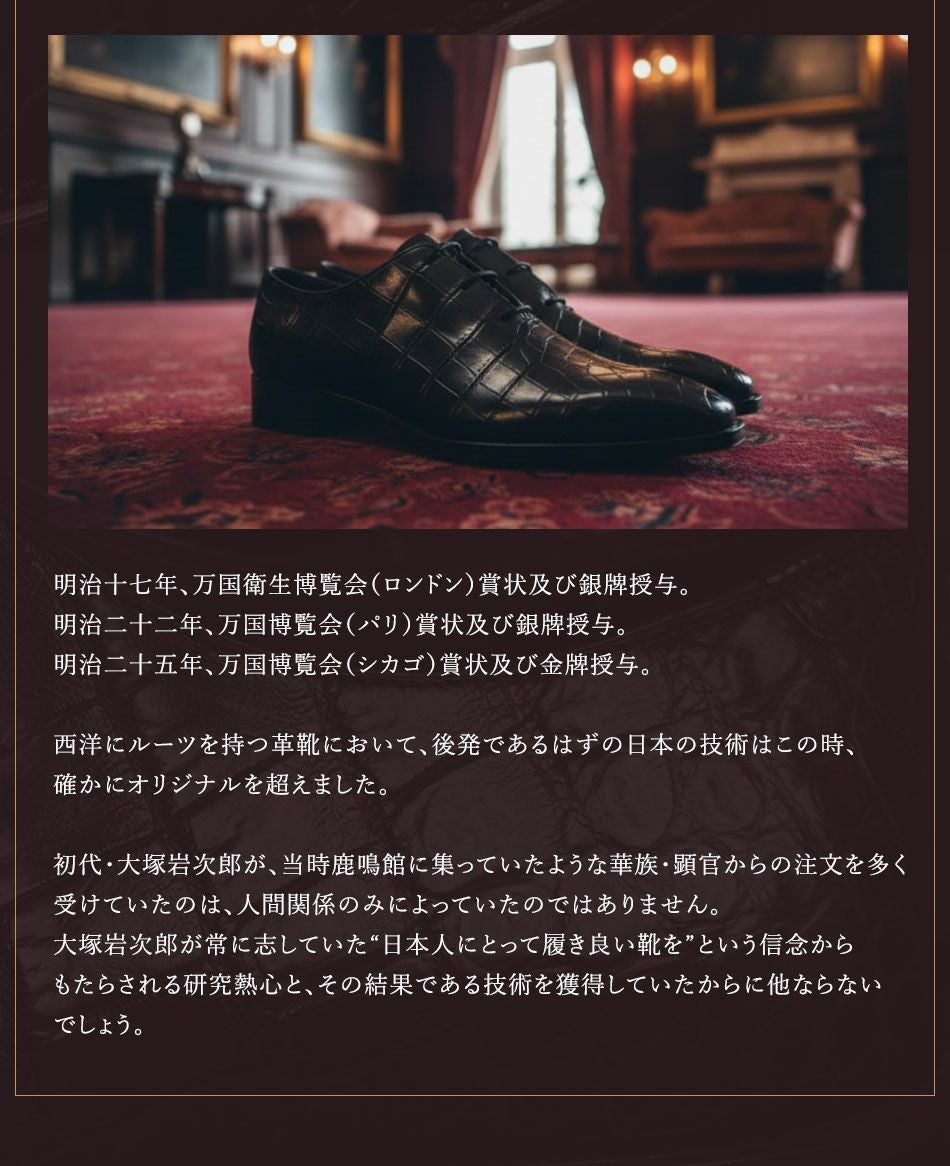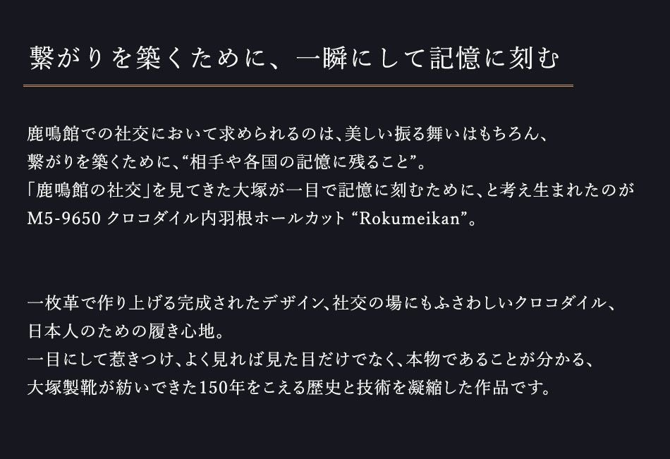 他の画像を見る 【大塚製靴/オーツカ/otsuka】最上級ライン OTSUKA M-5 M5-9650 クロコダイル内羽根ホールカット “Rokumeikan”(ロクメイカン) ブラック 【2026年5月下旬頃出荷】 税込価格 ¥ 1,584,000 税込 ×完売 カートに入れる お気に入りに登録する