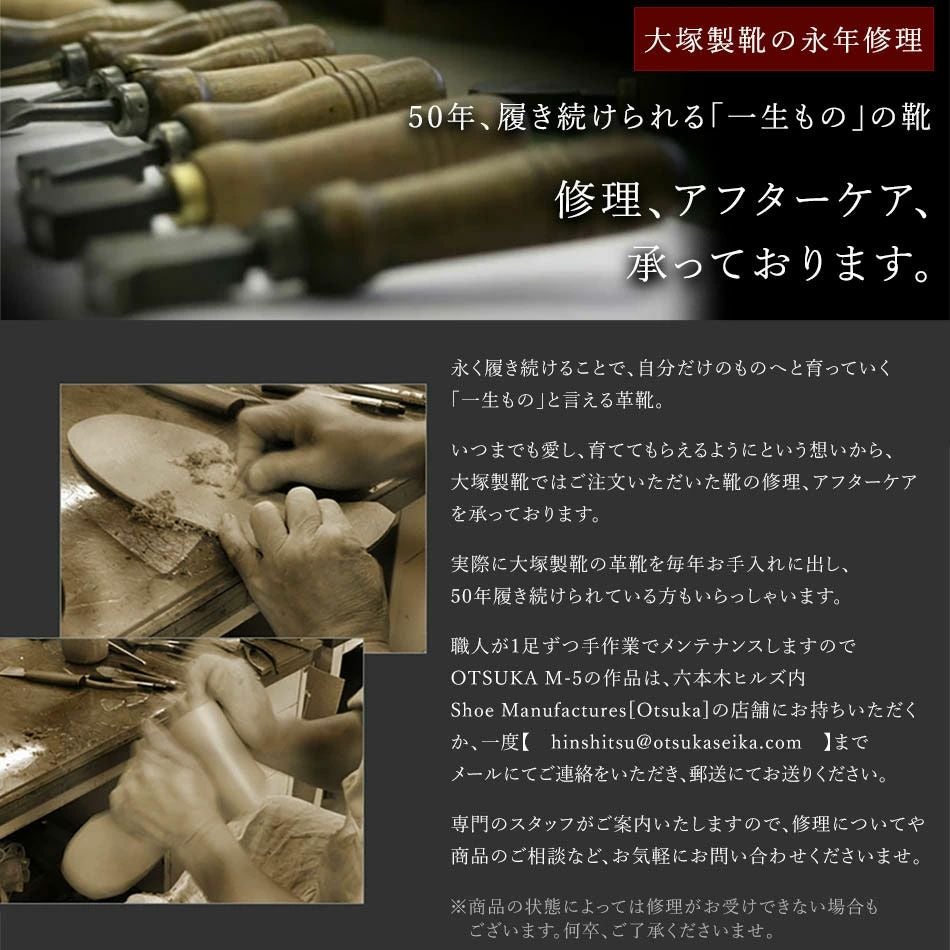他の画像を見る 大塚製靴(OTSUKA/オーツカ) Otsuka +M5(プラスエムファイブ)M5-602 内羽根セミブローグ グッドイヤーウェルト式製法 税込価格 ¥ 121,000 税込 カートに入れる お気に入りに登録する